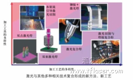 就拿激光焊接技術(shù)來(lái)說(shuō),在激光復(fù)合工藝的發(fā)展中已出現(xiàn)了如雙點(diǎn)或雙束激光的復(fù)合、激光與電弧的復(fù)合、激光與攪拌摩擦熱復(fù)合以及激光與電阻熱復(fù)合等形式;并呈現(xiàn)與其他相關(guān)技術(shù)結(jié)合及功能延伸的趨勢(shì),如與水射流、鉚接等結(jié)合而形成的新工藝(見(jiàn)圖)。