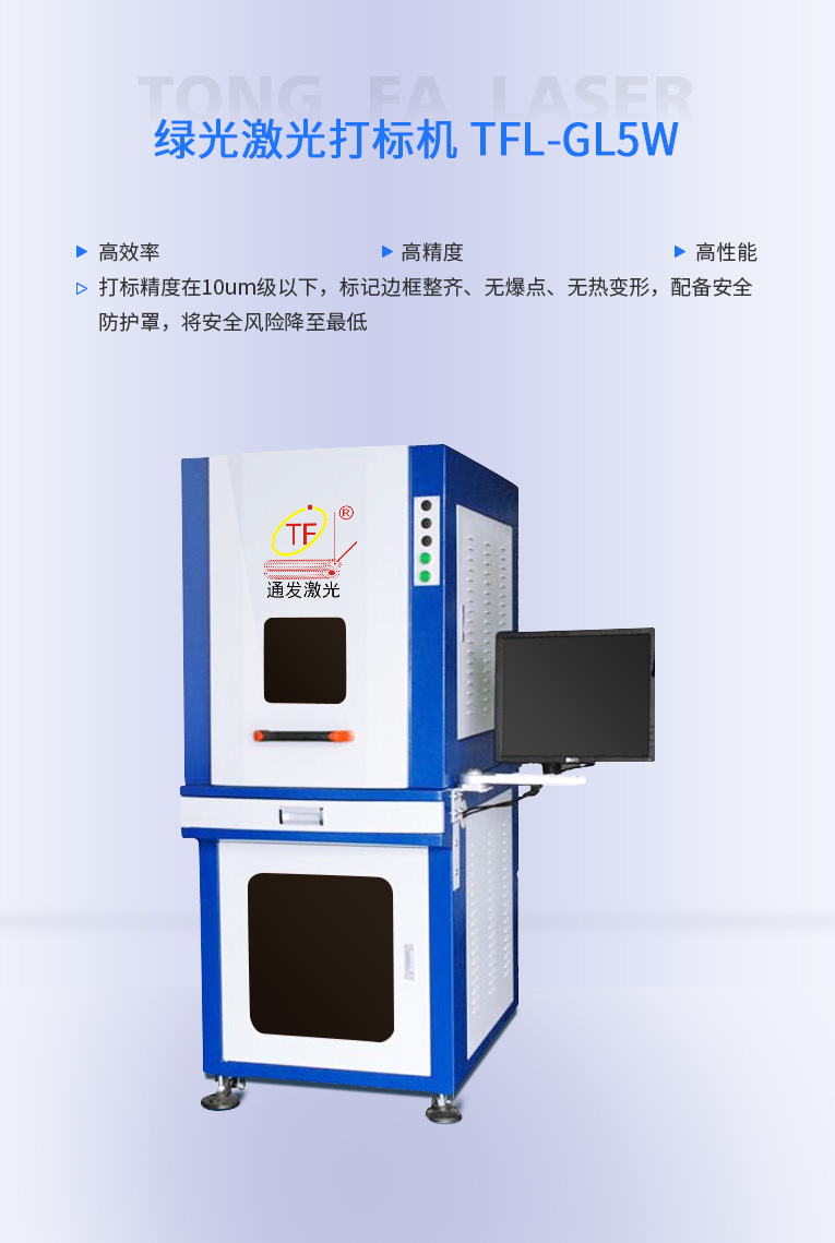 通發(fā)激光研發(fā)的TFL-GL3W/5W 綠光激光打標(biāo)機(jī)配備安全防護(hù)罩,避免設(shè)備操作員誤操作引起的人身傷害,將安全風(fēng)險(xiǎn)降至最低,產(chǎn)品遠(yuǎn)銷(xiāo)海內(nèi)外.打標(biāo)精度在10μm級(jí)以下,標(biāo)記邊框整齊、無(wú)爆點(diǎn)、無(wú)熱變形,有效提高加工的成品合格率,使用壽命長(zhǎng)、配合全封密光路、特別加固的光路底座滿(mǎn)足長(zhǎng)期、穩(wěn)定性的工作需要。
