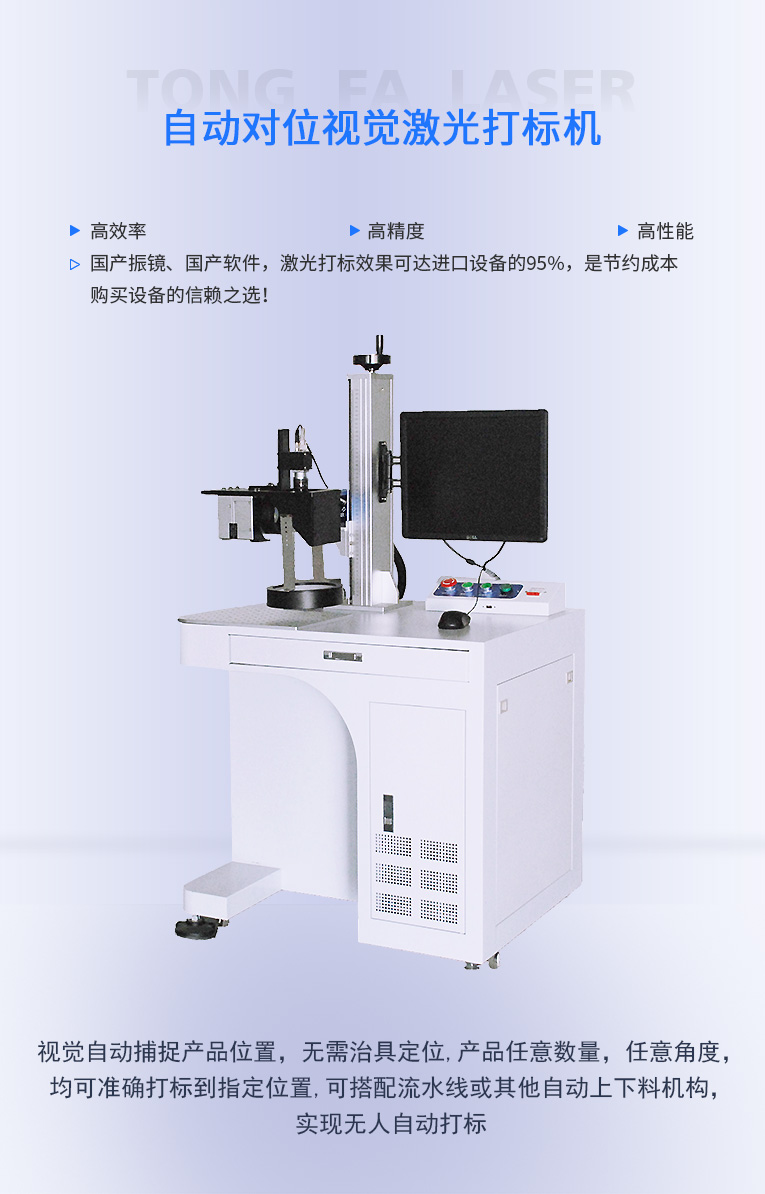 通發(fā)激光研發(fā)的自動(dòng)對(duì)位視覺激光打標(biāo)機(jī)TFL-F20CY-ZD,視覺自動(dòng)捕捉產(chǎn)品位置,無(wú)需治具定位,產(chǎn)品任意數(shù)量,任意角度,均可準(zhǔn)確打標(biāo)到指定位置,可搭配流水線或其他自動(dòng)上下料機(jī)構(gòu),節(jié)省人力,實(shí)現(xiàn)無(wú)人自動(dòng)打標(biāo),可搭配流水線或其他自動(dòng)上下料機(jī)構(gòu),節(jié)省人力,實(shí)現(xiàn)無(wú)人自動(dòng)打標(biāo),極高的重復(fù)頻率,打標(biāo)速度快;極高的光學(xué)質(zhì)量,實(shí)現(xiàn)精細(xì)打標(biāo),可與光纖、CO2、半導(dǎo)體等各種波長(zhǎng)的激光光路集成.
