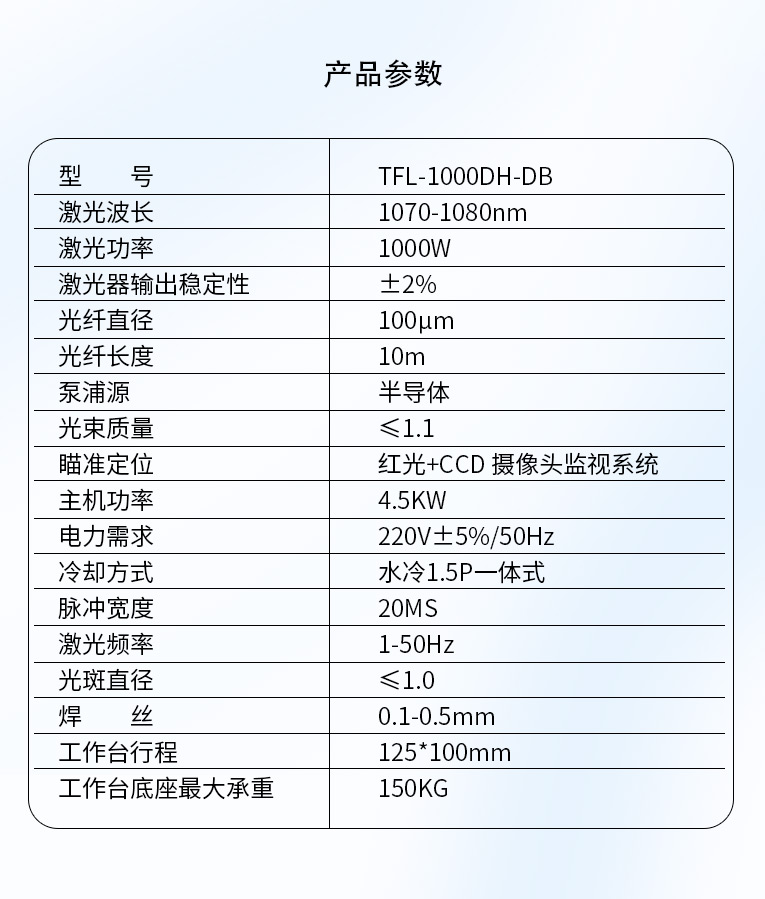 采用光纖激光器,反射率高,能量強,免維護,免調光,功耗少,相比傳統(tǒng) 模具焊來說,體積小,安全,穩(wěn)定性好超長使用壽命。 1000W光纖激光器,滿足銅、鋁焊接量大的模具及產品焊接加工需要。 高承重底座及工作臺,保持輕便靈活的優(yōu)點,同時提供更高承載能力。 配備.1.5P大功率一體式水冷水機,保證了大功率焊接的穩(wěn)定性。